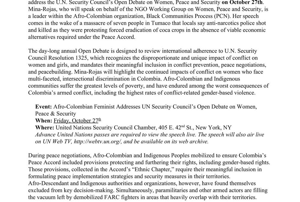 Charo Mina-Rojas, a long-time Afro-Colombian activist who has been involved in her country’s peace process since the 22-day civil strike in Buenaventura, Colombia, will speak to the United Nations Security Council this month. See the document below for the official statement. Mina-Rojas is also a BAP member and organizes for Proceso de Comunidades Negras.